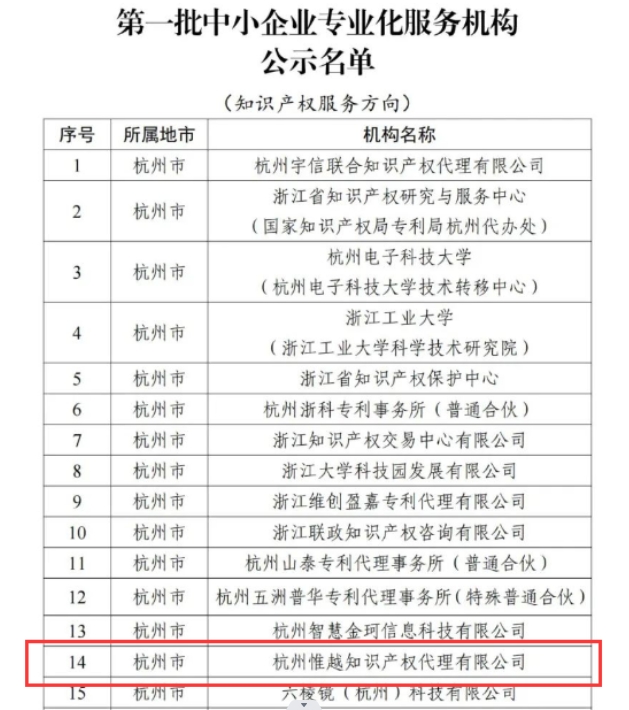 喜報!!關(guān)于杭州惟越知識產(chǎn)權(quán)代理有限公司入選浙江省首批中小企業(yè)專業(yè)化服務(wù)機構(gòu)的公示